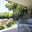 Il giardino intorno alla casa comunica col patio sul retro dove è presente la doccia esterna.
