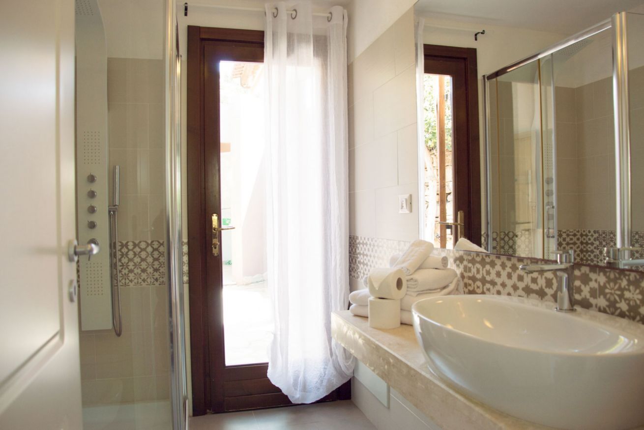 I due bagni rifiniti con materiali di pregio hanno una speciale grande doccia.